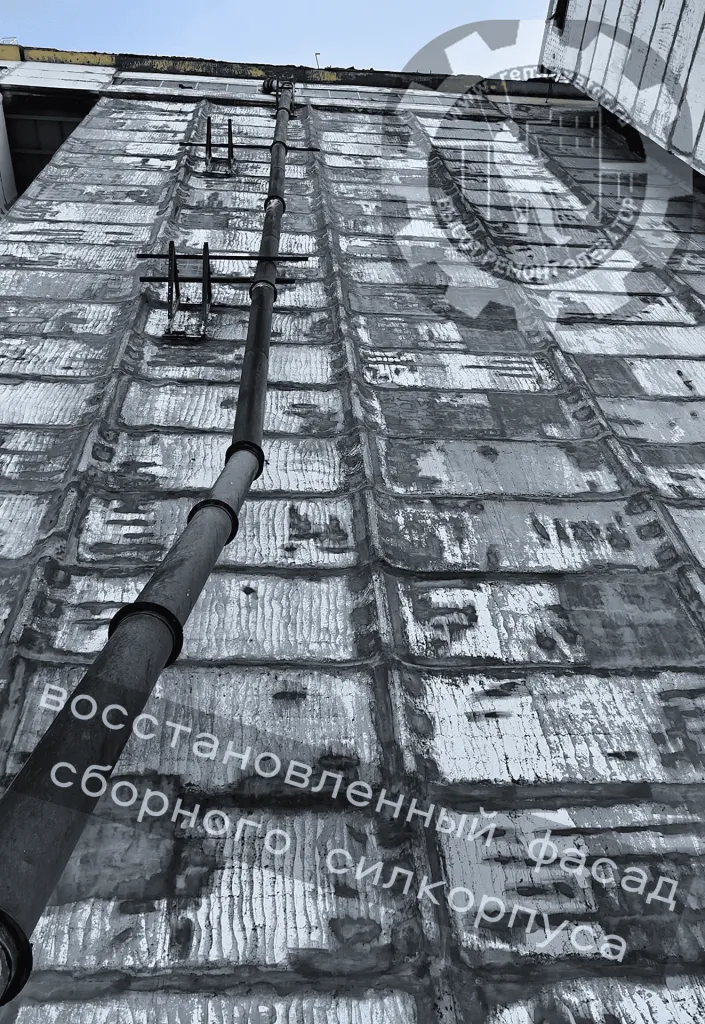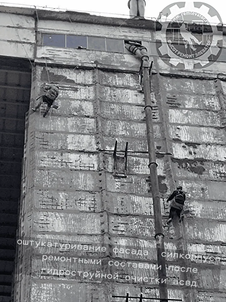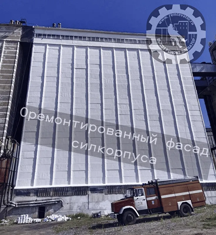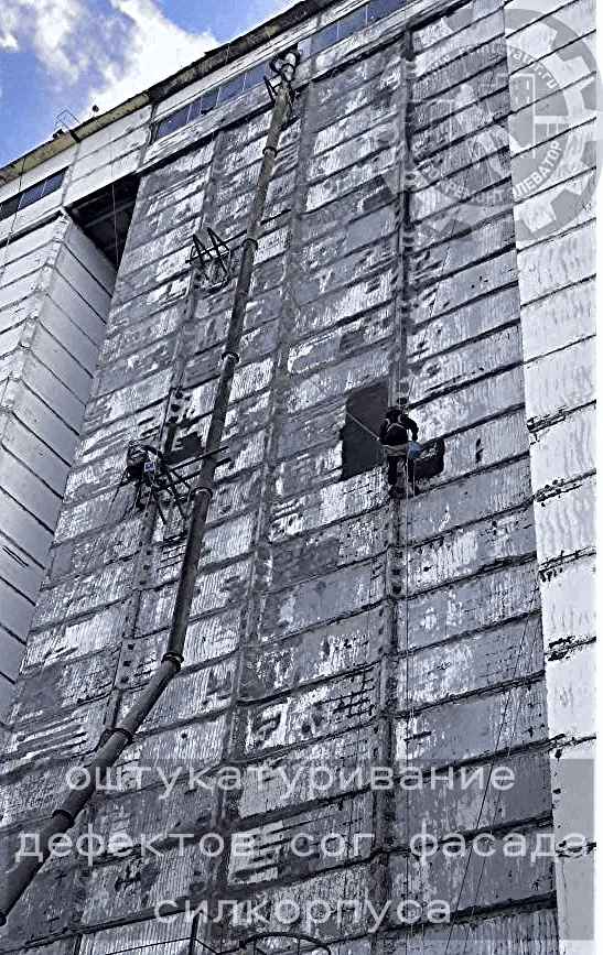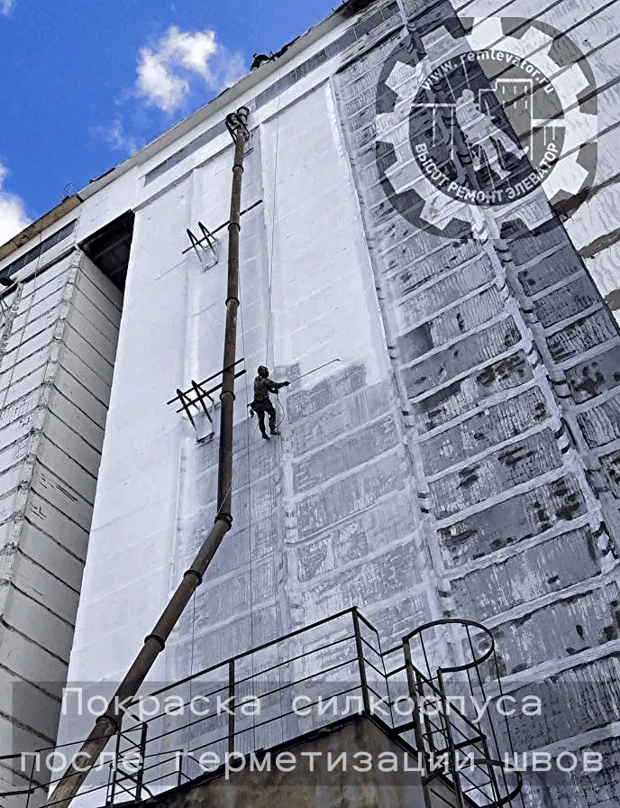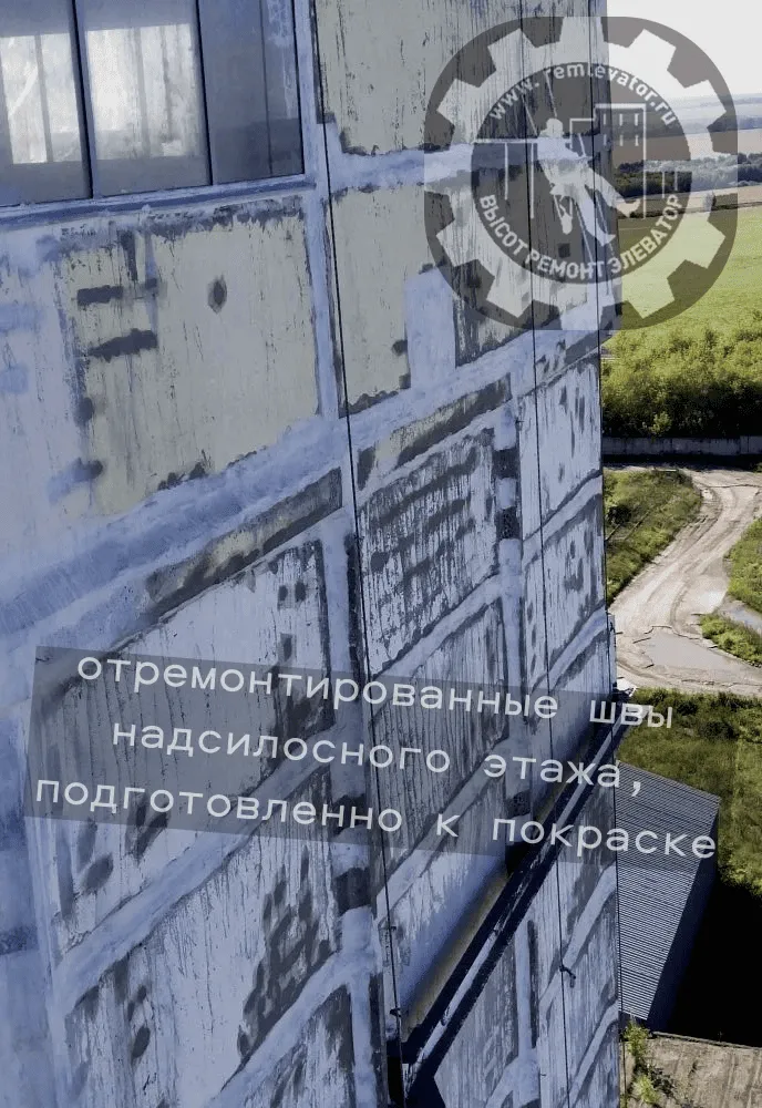 В начале 2024 года к нам обратилась администрация данного элеватора с просьбой отремонтировать фасад сборных силосных корпусов,( тщательно загеметизировать межсоговые швы и покрасить фасад), так как не смотря на недавний ремонт, протечки швов и надсилосного этажа не ушли. После предварительного осмотра создалось такое впечатление, что основная проблема, это некачественая мастика, которой работал предыдущий исполнитель, так как на одной трети участков она просто отслоилась и висела лохмотьями.