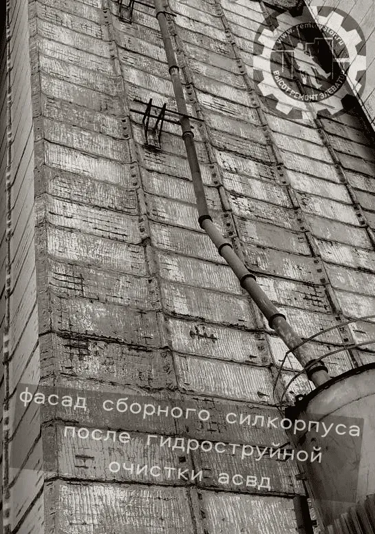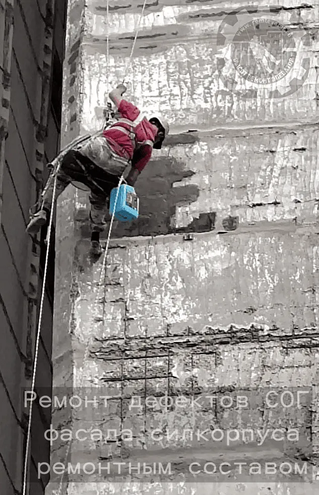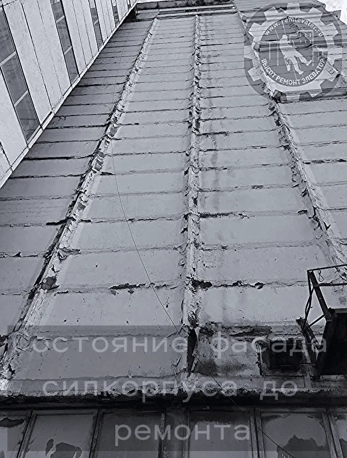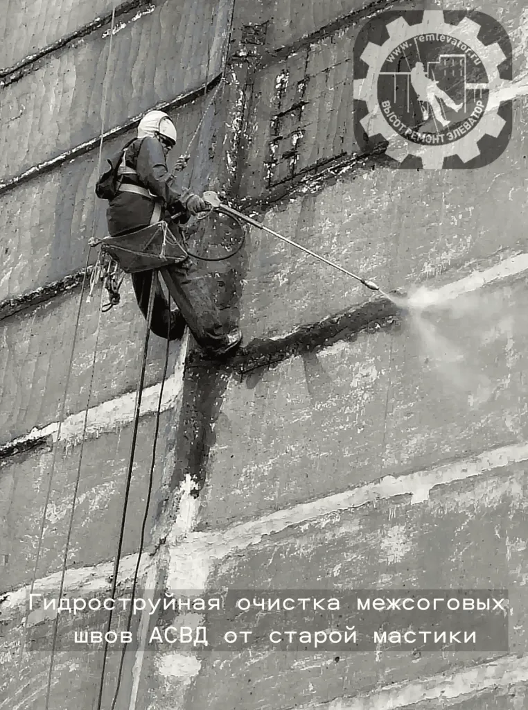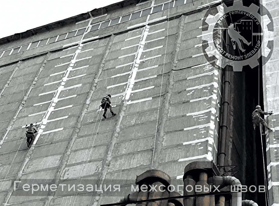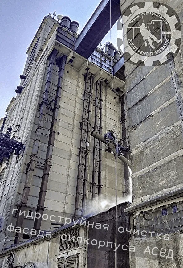 В начале 2024 года к нам обратилась администрация данного элеватора с просьбой отремонтировать фасад сборных силосных корпусов,( тщательно загеметизировать межсоговые швы и покрасить фасад), так как не смотря на недавний ремонт, протечки швов и надсилосного этажа не ушли. После предварительного осмотра создалось такое впечатление, что основная проблема, это некачественая мастика, которой работал предыдущий исполнитель, так как на одной трети участков она просто отслоилась и висела лохмотьями.